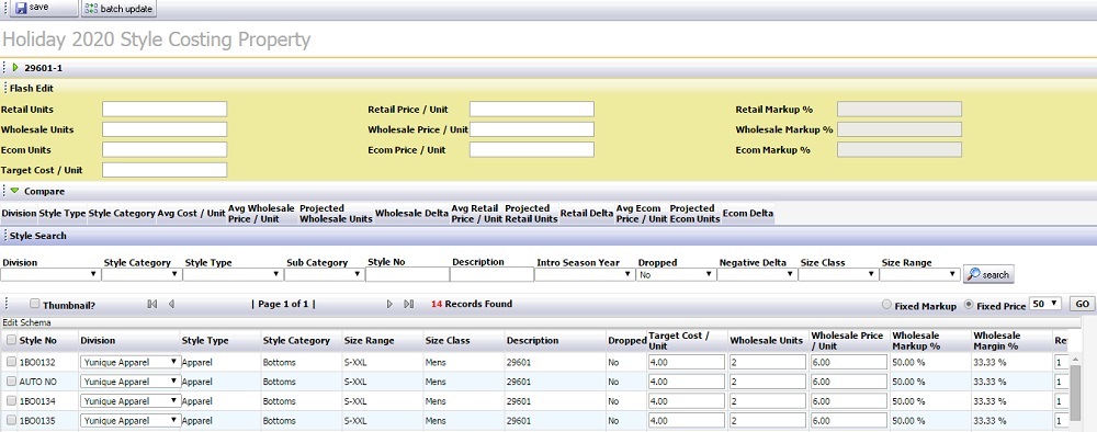 Сверху расположены кнопки: "save" (сохранение внесенных изменений) и "batch update" (возможность установить выбранные атрибуты для всех выбранных стилей сразу).