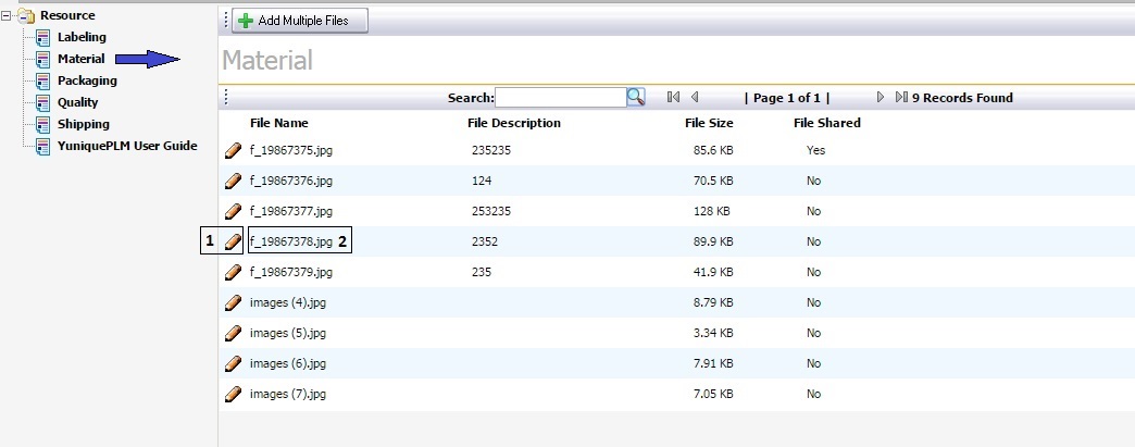 Resource Folder - библиотека файлов. Все файлы делятся по различным категориям (Labeling, Material, Packaging, Quality, Shipping, YuniquePLM User Guide). Для всех созданных категорий настраивается доступ в Home > Admin > Group.