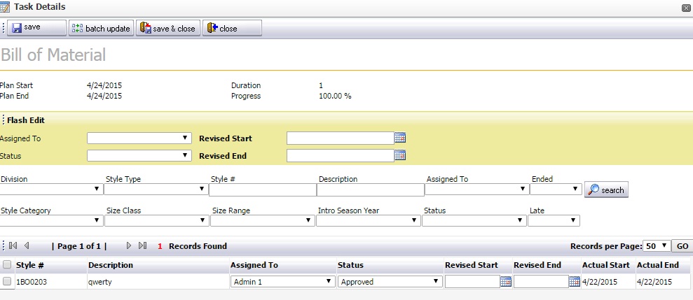 В Task Details показываются все элементы, где есть текущая задача. Так, например, если рассматривается workflow в стилях Bill of Material, то здесь отображаются все стили, в которых есть BoM и в которые добавлен текущий календарь (на скриншоте ниже рассматривается 3-D Files в материалах).